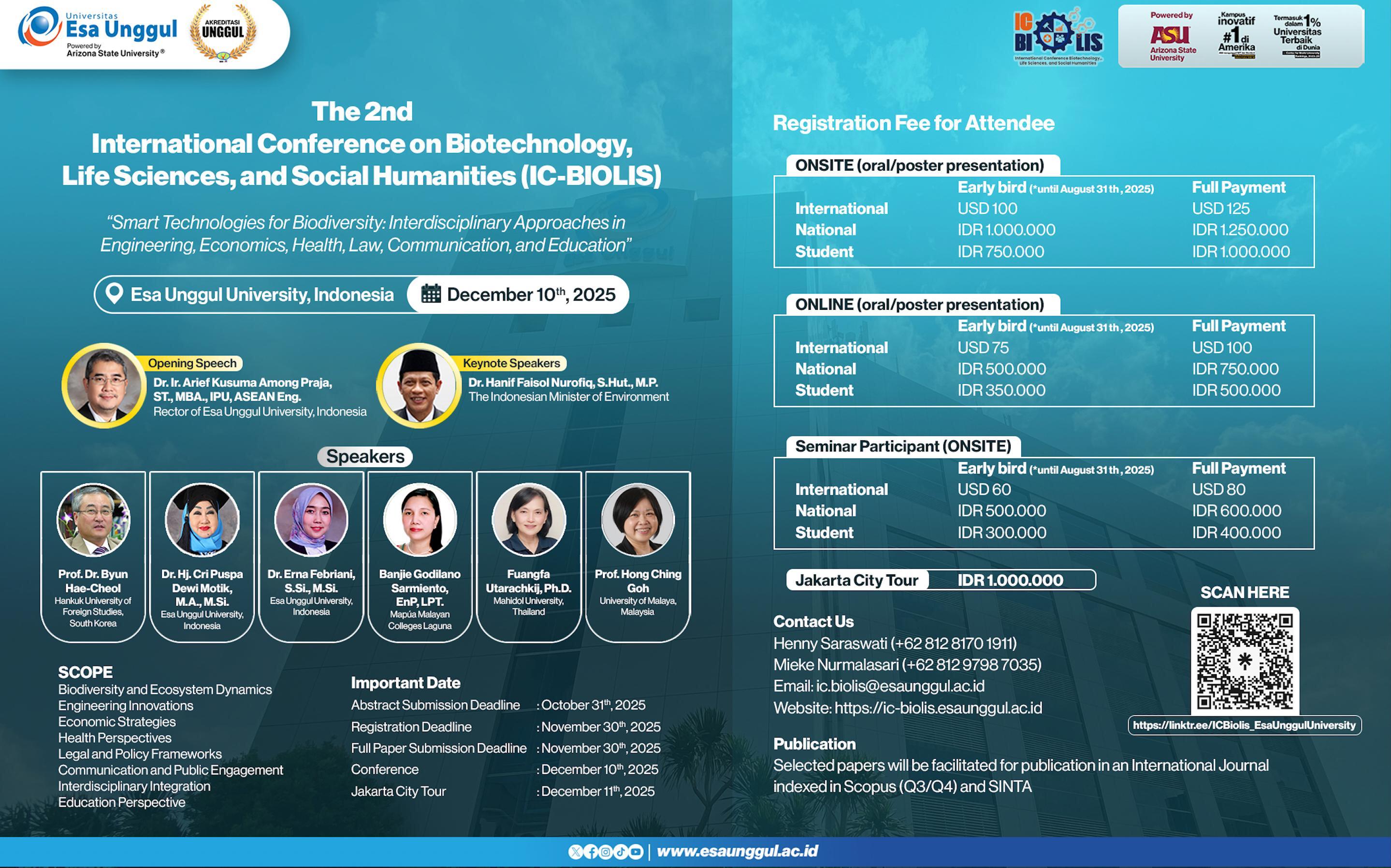 Register & submit paper: https://linktr.ee/ICBiolis_EsaUnggulUniversity